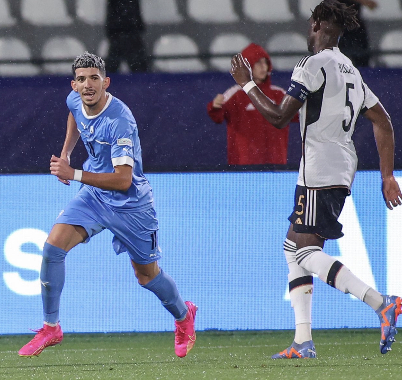 דור תורג׳מן הבקיע לישראל ששיחקה משך 45 דקות בעשרה שחקנים. המצטיין היה השוער דניאל פרץ שעצר שני פנדלים (2 ו-78) וסידר לחבורה של גיא לוזון, ששיחקה בעשרה שחקנים יותר ממחצית, נקודה סופר מפתיעה מול אלופת אירופה המכהנת • דור תורג'מן הדהים את הגרמנים עם שער נהדר ויתרון מפתיע בדקה ה-20, אבל יאן ביסק השווה (26). עדן קארצב הורחק על סף הירידה למחצית ואוסקר גלוך נפצע והוחלף.