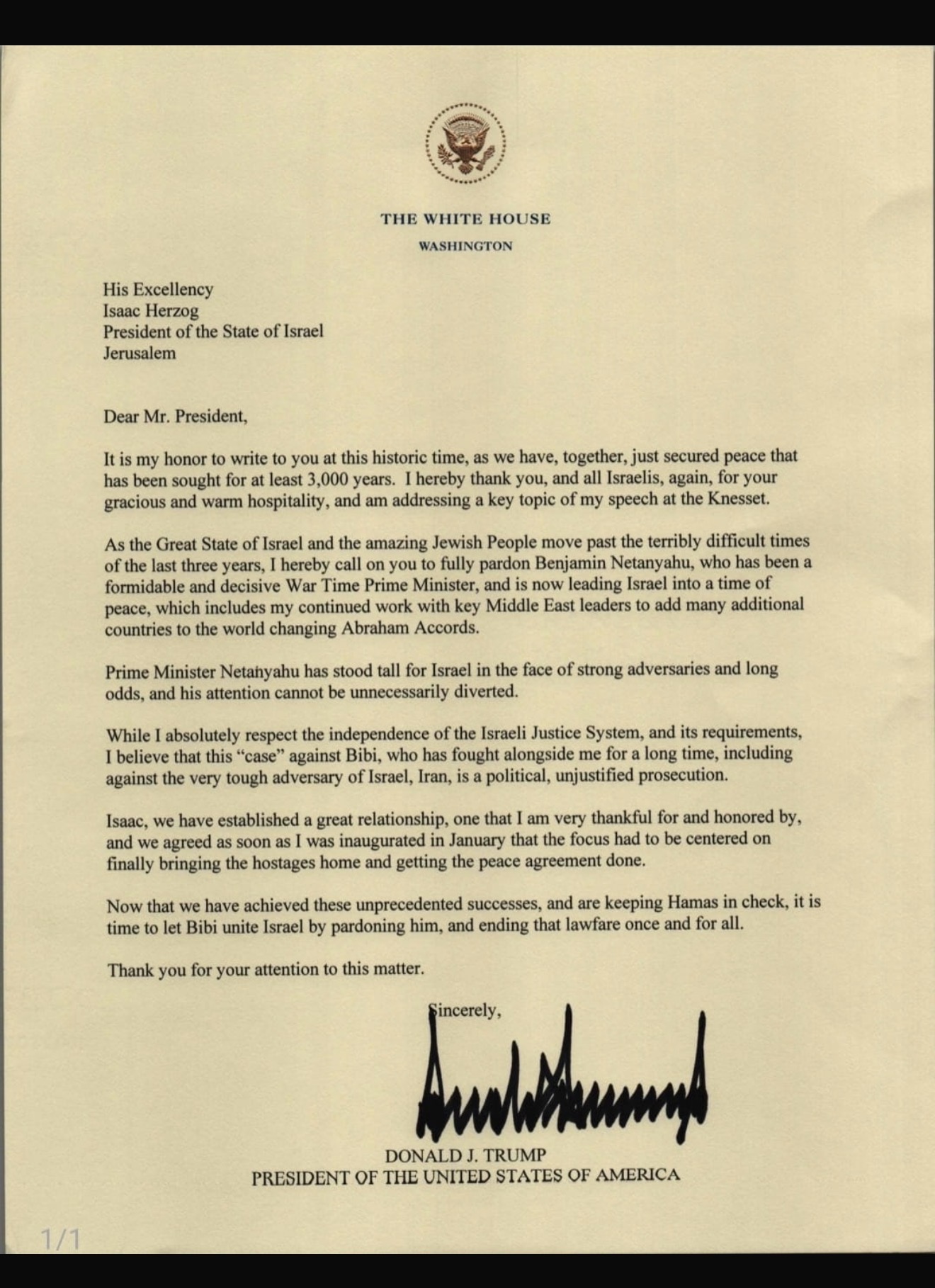 מאחר שמדינת ישראל הדגולה והעם היהודי המופלא נעים כעת מעבר לתקופות הקשות ביותר של שלוש השנים האחרונות, אני קורא לך להעניק חנינה מלאה לבנימין נתניהו, שהיה ראש ממשלת מלחמה נחוש ונפלא, וכעת מוביל את ישראל לעידן של שלום — שלום הכולל את המשך עבודתי עם מנהיגים מרכזיים במזרח התיכון, כדי להוסיף מדינות נוספות להסכמי השלום ההיסטוריים – “הסכמי אברהם”.