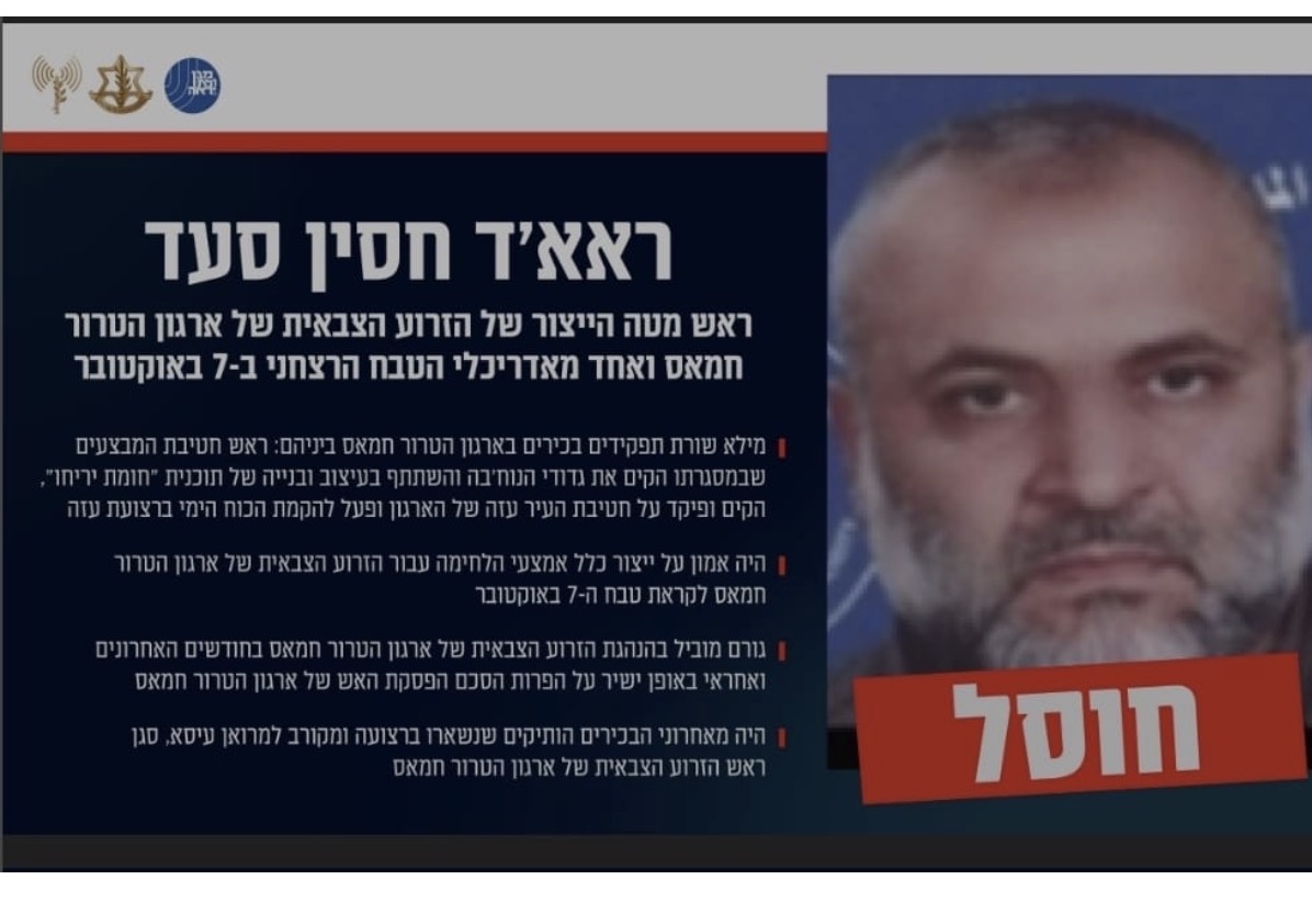 דובר צה"ל ודוברות שב"כ מודיעים כי היום, ה-13 בדצמבר 2025, צה״ל ושב״כ תקפו וחיסלו את ראש מטה הייצור של הזרוע הצבאית בארגון הטרור חמאס ואחד מאדריכלי טבח ה-7 באוקטובר, ראא׳ד חסין סעד.